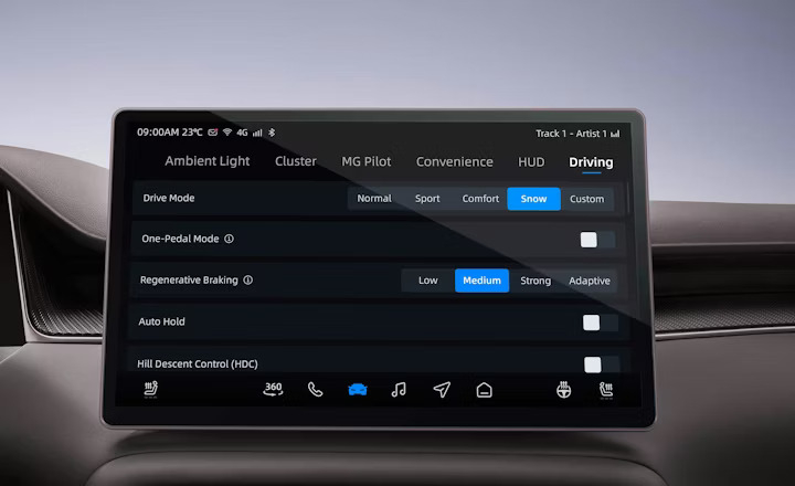 Intelligente ElektronikDie intelligente Elektronik des MGS6 EV sorgt für ein ausgewogenes Zusammenspiel aus Dynamik und Kontrolle. Fünf Fahrmodi stehen Dir zur Verfügung: Normal, Sport, Eco, Snow und Custom – jeweils abgestimmt auf Straßenbedingung und Fahrsituation. Serienmäßig werden beim MGS6 EV die Hinterräder angetrieben. Das Topmodell MGS6 EV Luxury AWD wählt je nach Fahrsituation automatisch zwischen Hinterrad- und Allradantrieb und bietet so noch mehr Dynamik. Der MGS6 bietet 4 Rekuperationsstufen zur leisen und effizienten Rückgewinnung der Bremsenergie. Und außerdem eine One-Pedel-Drive Einstellung zur direkten Nutzung der Rekuperationsenegrie.